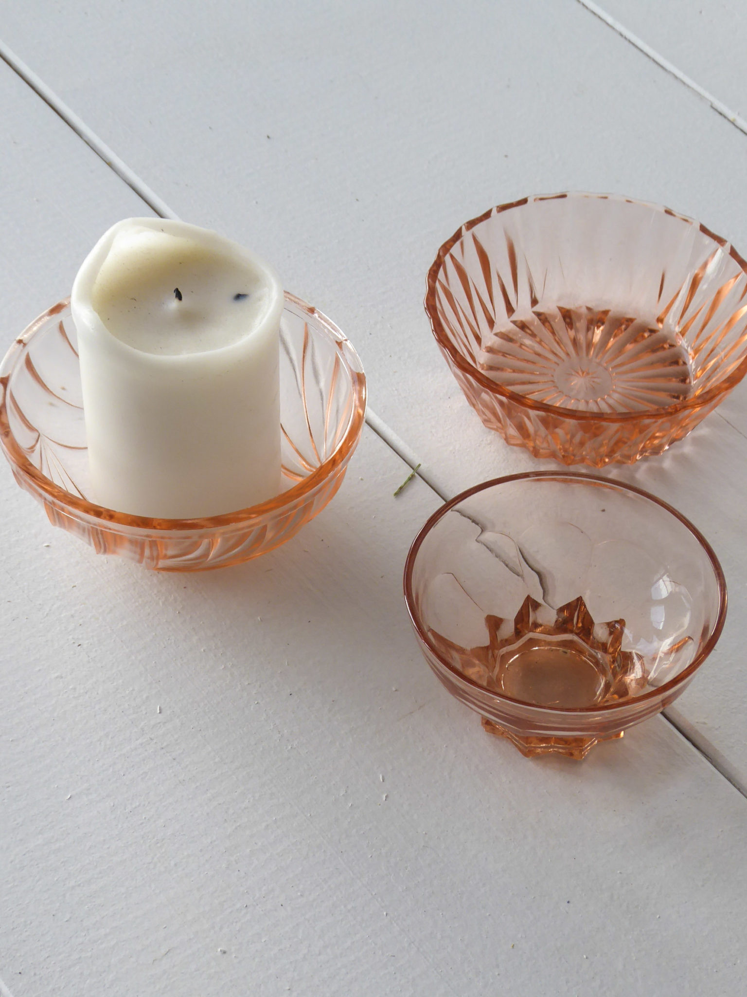Il s’agit de photophores (coupes, soucoupes et ramequins) en verre de couleurs dépareillées.