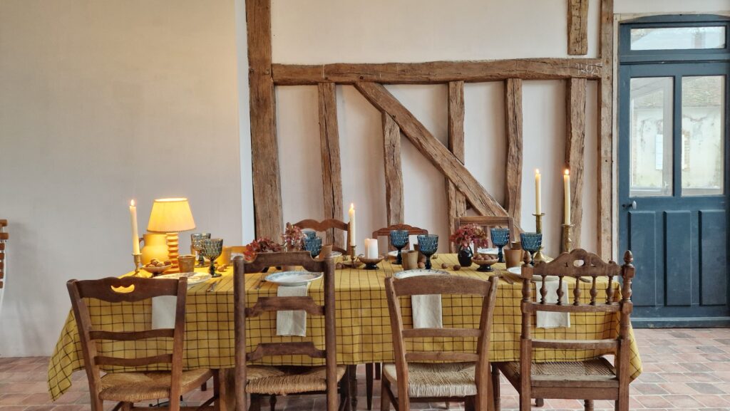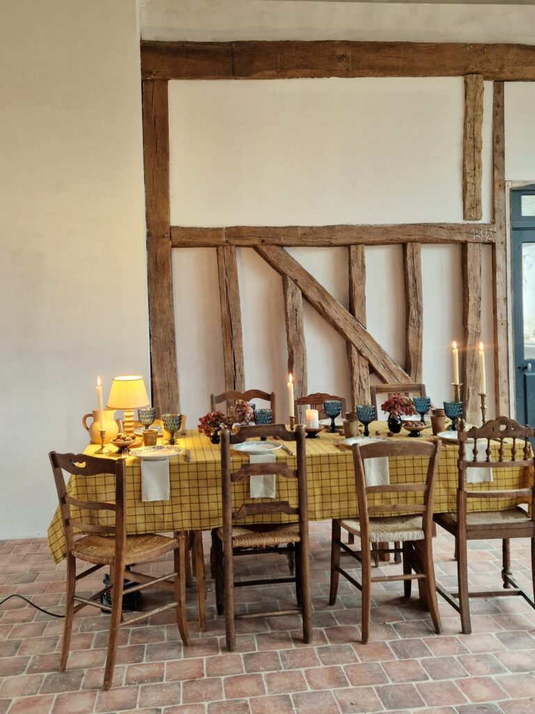 Deux modèles de chaises sont disponibles à la Villa Augustine. Nos chaises en bois dépareillées sont parfaites pour un mariage à la campagne. Nous avons dressé la table dans notre grande salle de réception, le sol est en tommettes et nous avons pu conservé un élément en colombages lors de la rénovation.