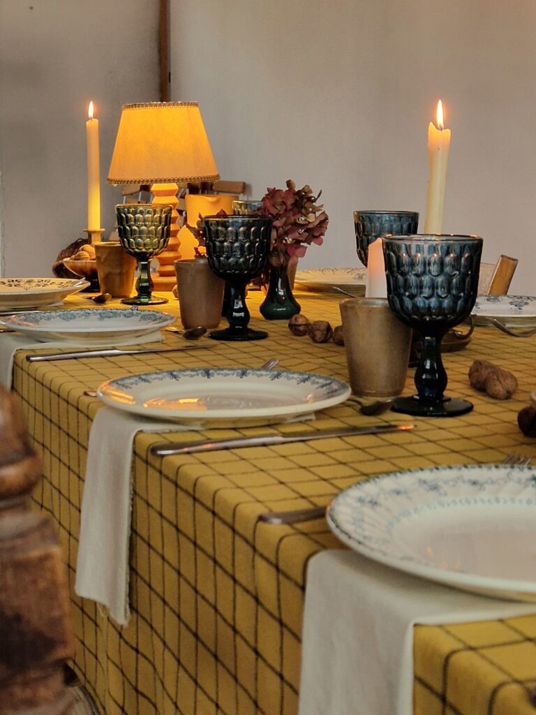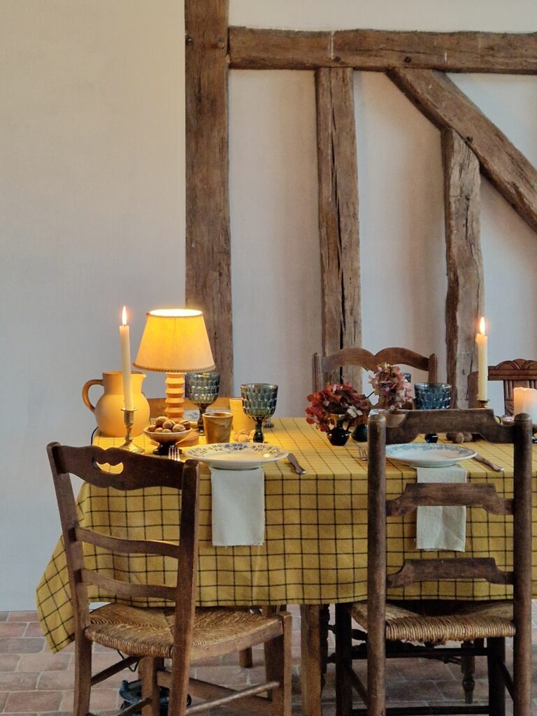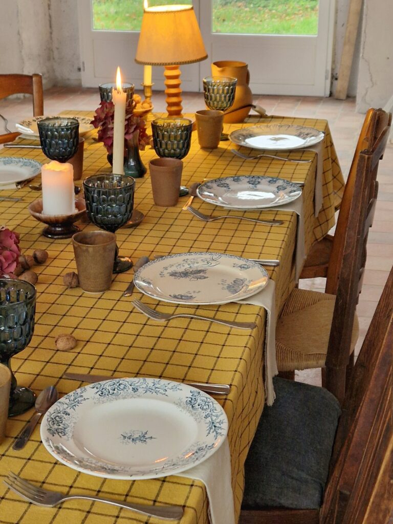 Evidemment, le blanc est intemporel et très élégant. Mais pour la table d’un mariage d’automne à la campagne, on peut se permettre un choix plus chaleureux et moins stricte. Nous avons choisi une nappe moutarde à carreaux trouvée à la Foir Fouille. Il est quasiment impossible de trouver une nappe similaire en location. C’est pourquoi voici quelques astuces : acheter des métrages de tissu, acheter des nappes bon marché à offrir ensuite à vos proches ou revendre, teindre des draps anciens. J’ai choisi cette dernière solution pour les serviettes de tables beiges. Les tables de notre salle de réception sont des tables en bois qui peuvent être utilisées sans nappes. Vous pourriez choisir de ne napper que la table d’honneur. Notre décoration proposée ici rendrait également très bien sur une table en bois.